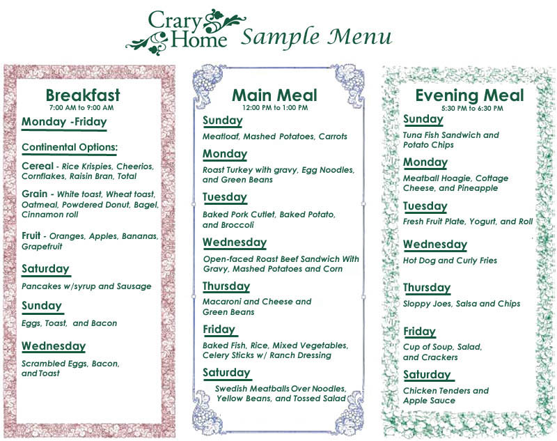 At The Crary Home we offer a variety of nutritional meals. Our staff accomodates special dietary needs of residents. Meals are served in the dining room of the main house.
